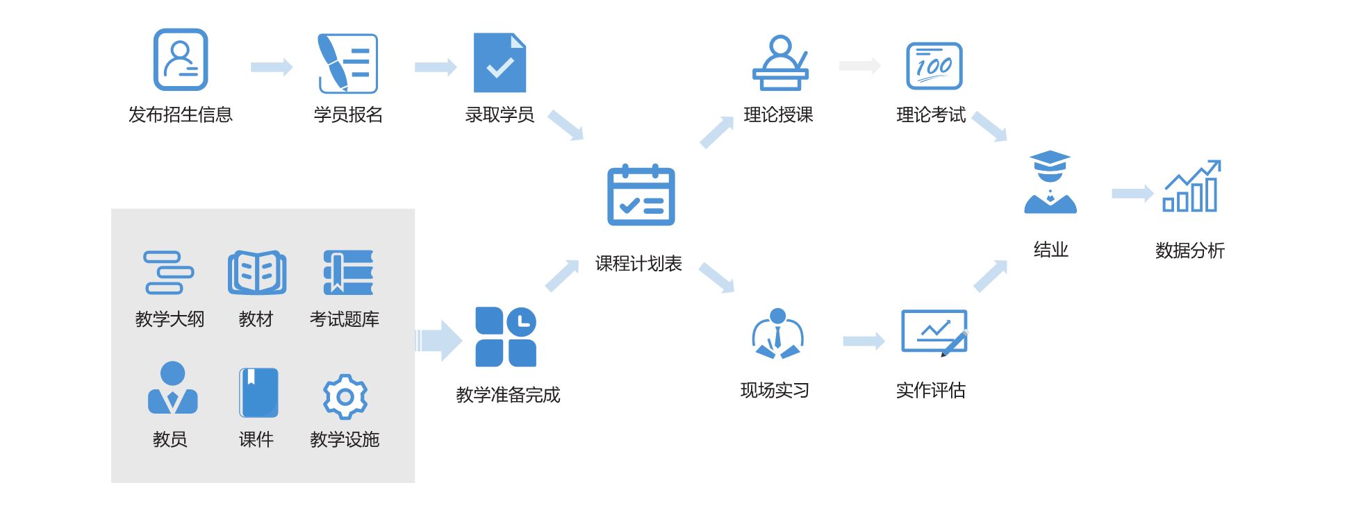 本平台覆盖培训机构的全业务链:从教学准备到招生,从理论授课到现场实作,从考试到结业,全 程线上管理。